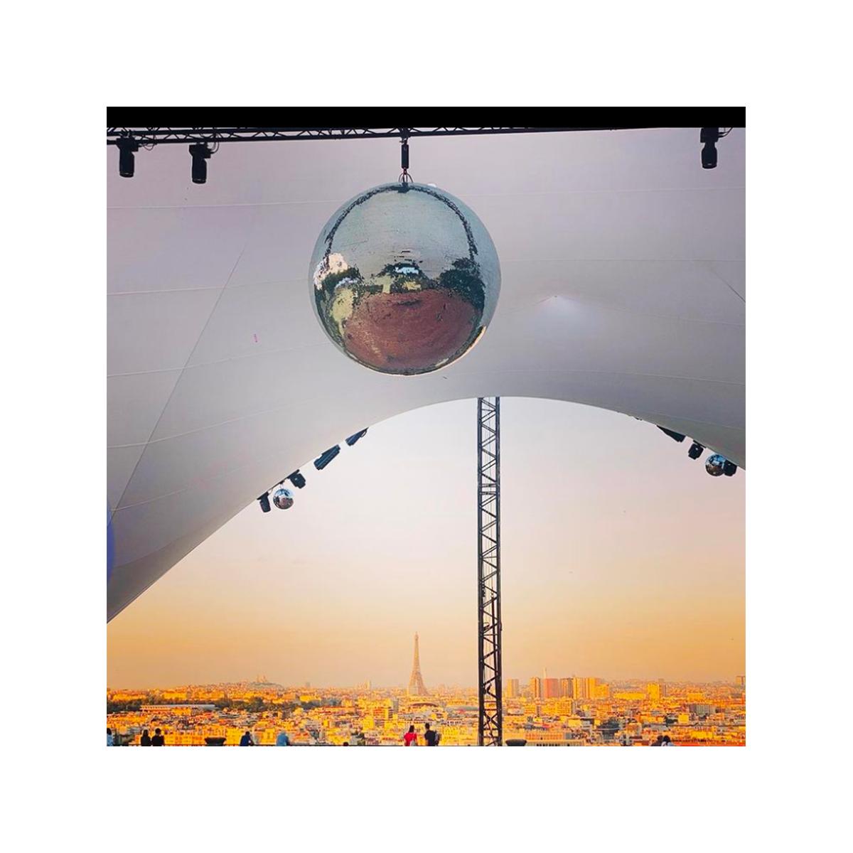Boule à facettes de 200 cm de diamètre avec un moteur pour assurer sa rotation ainsi qu’une cage afin de la protéger pendant le transport.
