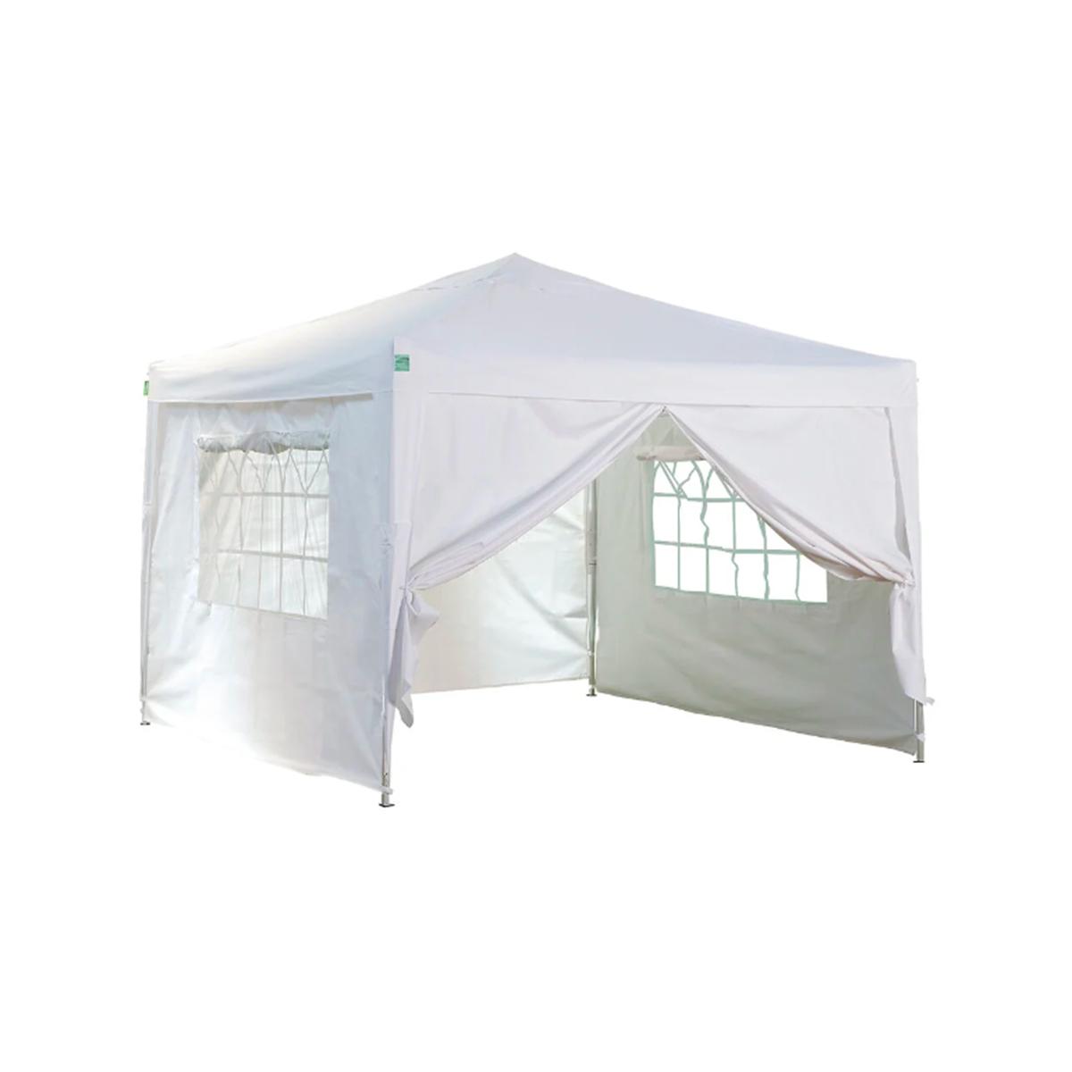 Tente blanche de 3 mètres par 3 mètres fournie avec 4 côtés (sans gouttières) et des lest de 40kg par pied.