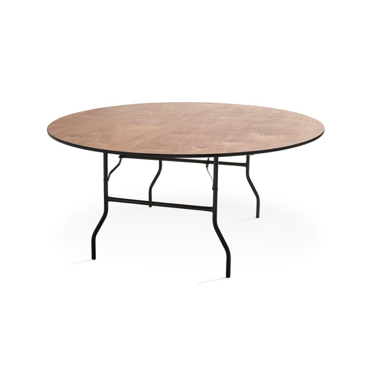 Table bois pliante ronde. Un plateau en contreplaqué de 18mm recouvert de deux couches de vernis polyuréthane clair.